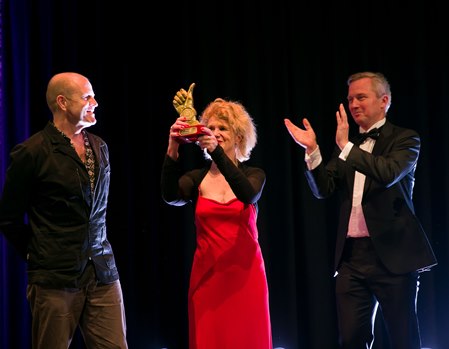 Andrew Greenwood en Anna Bishop nemen het applaus in ontvangst. Rechts wethouder Sport Eric van der Burg.