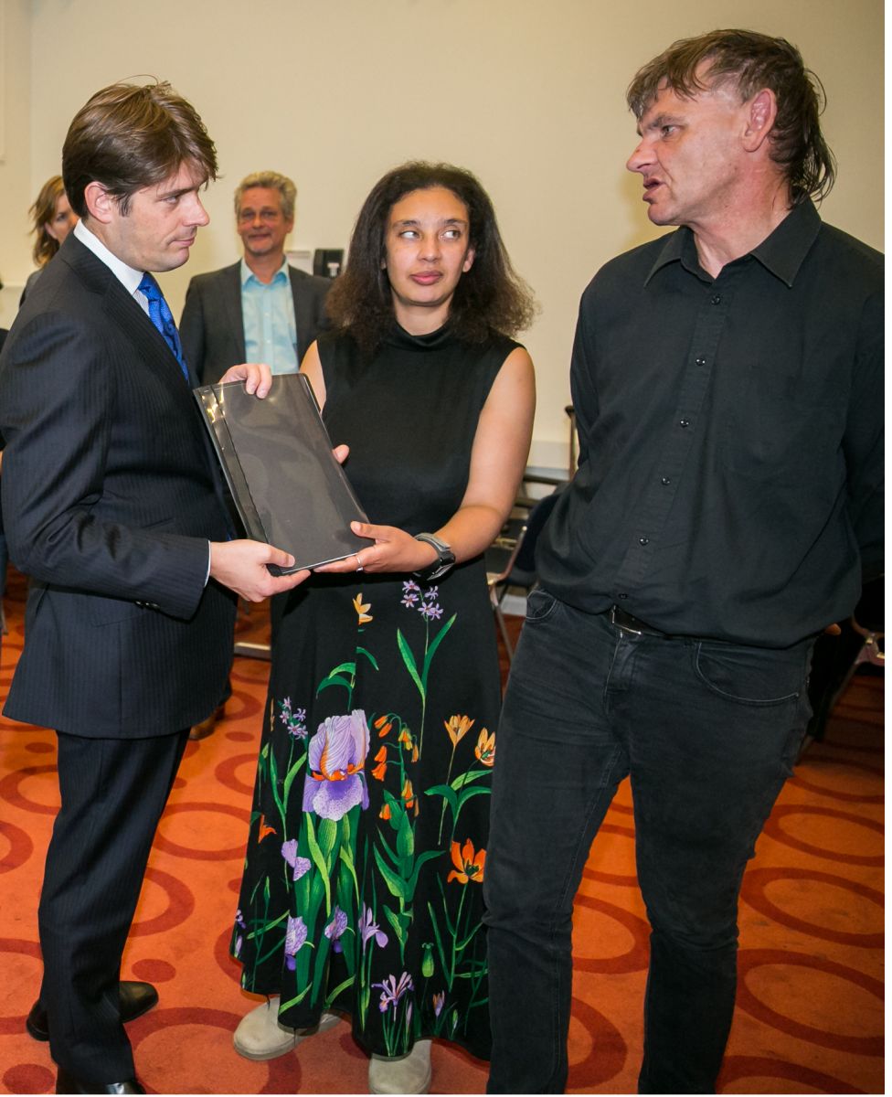 Foto v.l.n.r.: wethouder Vliegenthart, Tamara Heerenveen (Cliëntenraad Cordaan), Patric Hartwig (voorzitter Daklozenvakbond). Op achtergrond: Reinier Schippers (voorzitter MO/GGz Overleg). (Foto: Michael Graste, Flyershots)