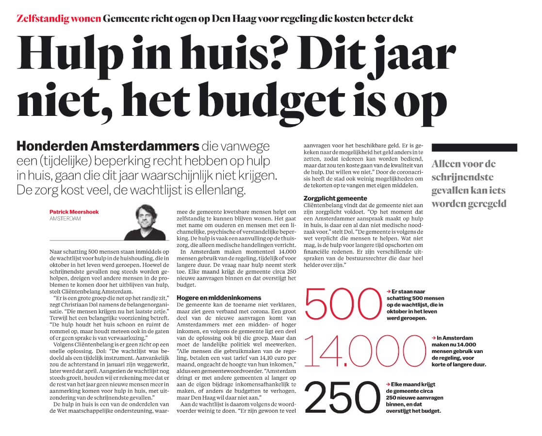 Maandag 18 januari verscheen het artikel 'Hulp in huis? Dit jaar niet, het budget is op' over Hulp bij het huishouden (Hbh) op de voorpagina van Het Parool. Onze jurist Christiaan Dol geeft hierin aan dat de gemeente Amsterdammers met een indicatie voor Hbh direct ondersteuning moet bieden. De gemeente heeft namelijk een zorgplicht. Op een wachtlijst plaatsen mag dus niet. Mensen op die op hulp moeten wachten, roepen we op zich bij ons te melden. Zo kunnen met hen nagaan wat de juridische mogelijkheden zijn.