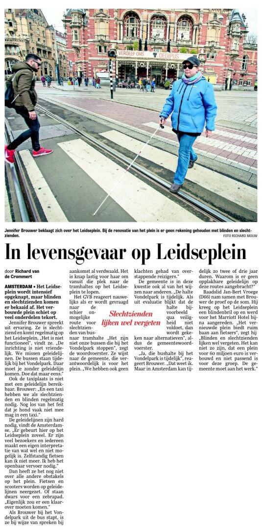 De Telegraaf publiceerde op 10 april een kritisch stuk over de veiligheid van het Leidseplein voor blinden en slechtzienden. Het Leidseplein wordt op dit moment gerenoveerd, en de vraag is of er wel goed gedacht is aan mensen met een visuele beperking. Cliëntenbelang Amsterdam adviseert projectbureau Leidseplein over toegankelijkheid en geeft toelichting.